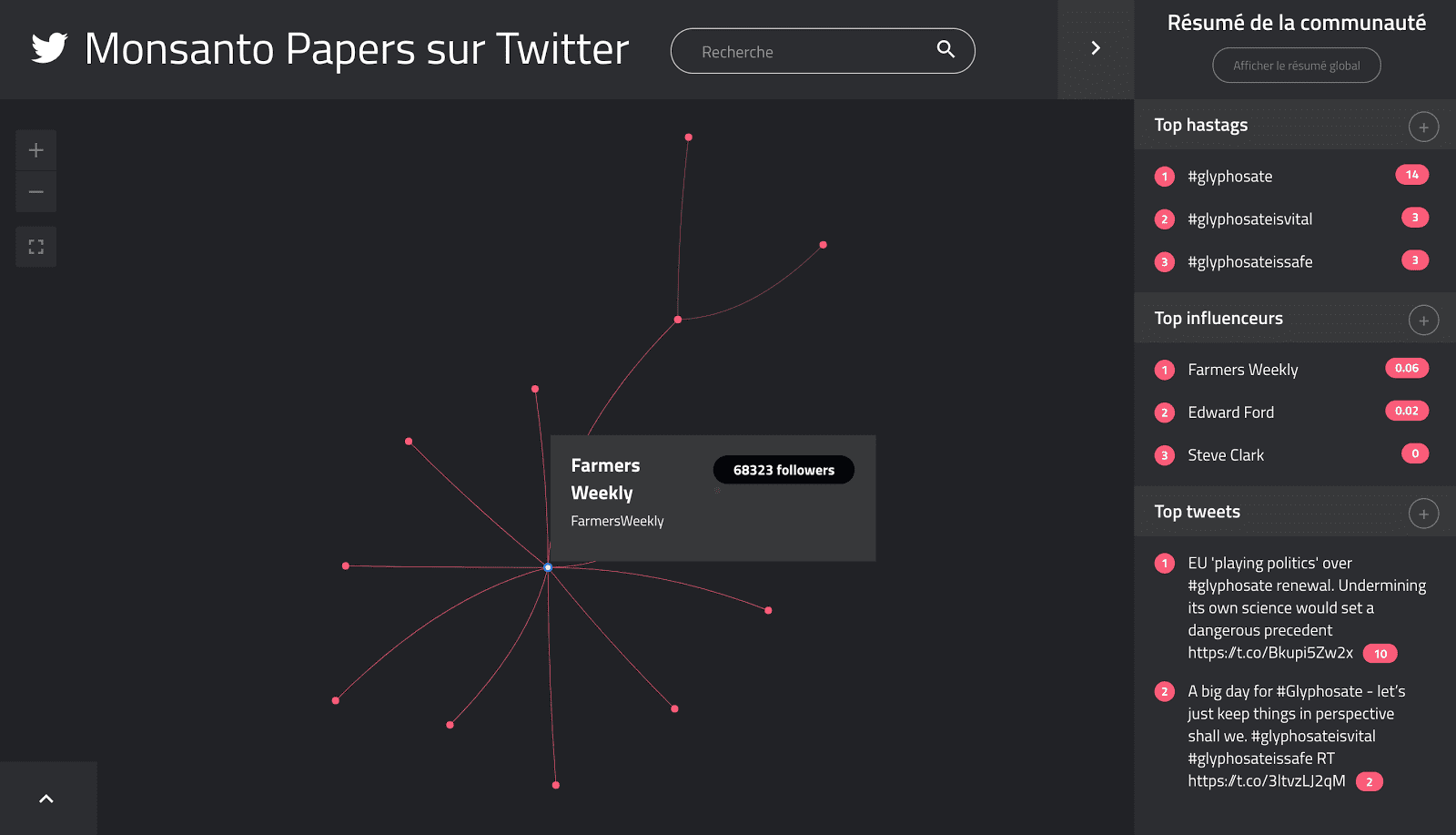 On remarque que le président Emmanuel Macron (défavorable à la fusion entre Bayer et Monsanto) est présent dans une communauté, aux côtés de Foodwatch France qui défend les consommateurs face aux lobbies alimentaires. Les tops tweets concernent le fait que la Fédération Nationale des Syndicats d’Exploitants Agricoles serait « accro » au glyphosate et l’interdiction de ce produit au Sri Lanka.