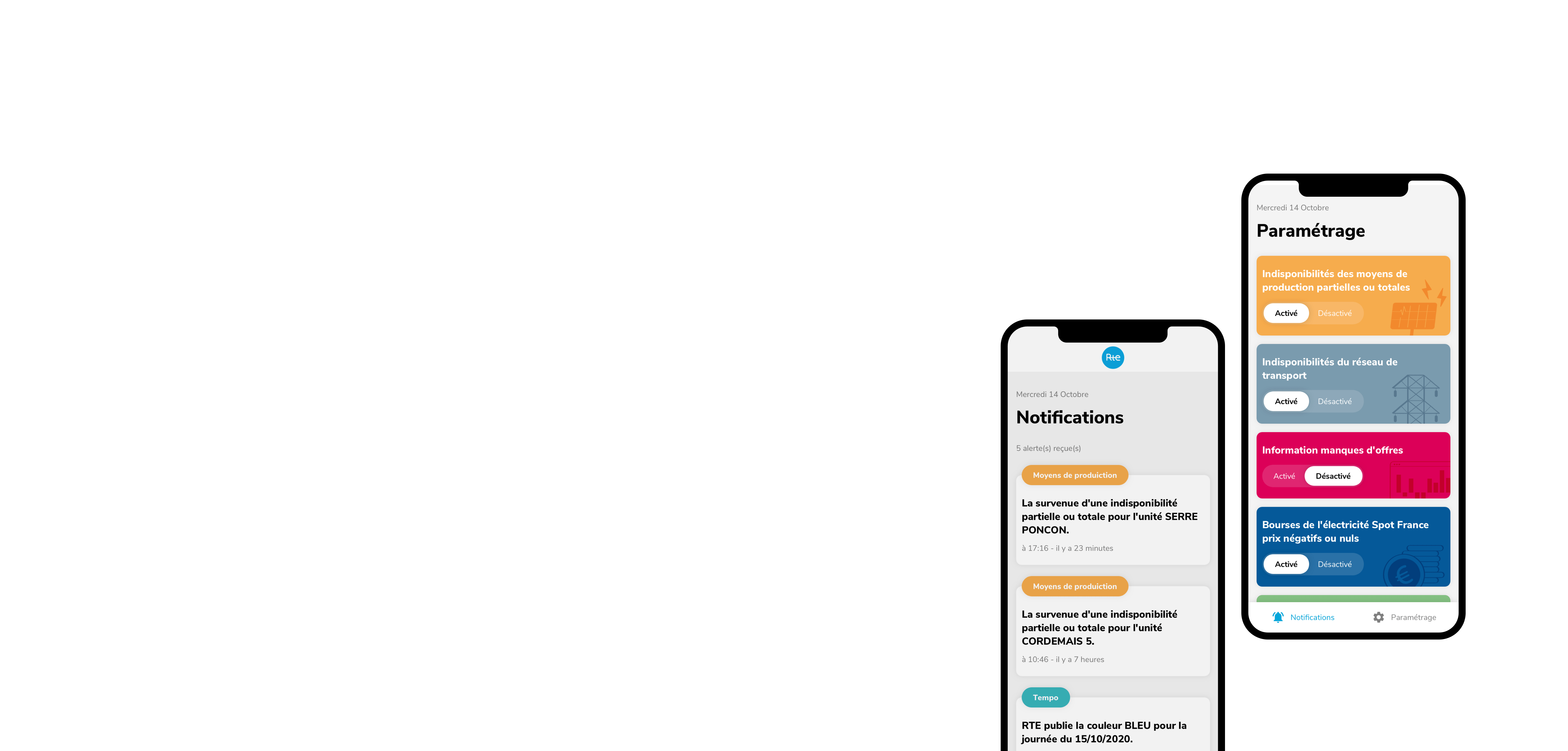 Fidèle à notre méthodologie projet, nous avons fait plusieurs ateliers techniques avec les représentants de RTE, centrés autour de l’interfaçage des différentes API générant ces notifications, ainsi que des workshops centrés autour de l’UI et de l’UX de l’application. La combinaison des maquettes produites et des informations récupérées à travers les API RTE ont permis de définir les contours de l’application, ses contenus et ses fonctionnalités.